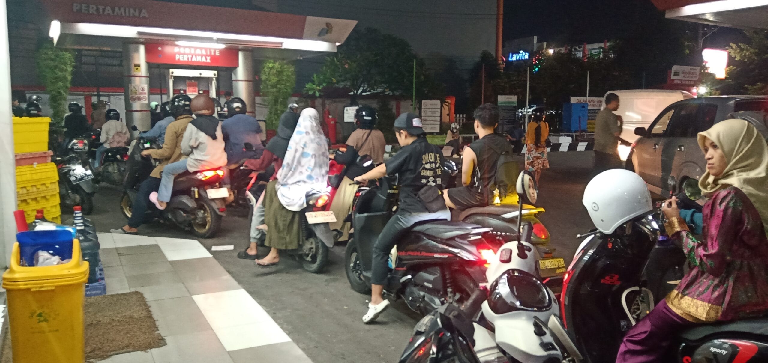 Deretan kendaraan roda dua maupun roda empat tampak mengular, menunggu giliran untuk mengisi bahan bakar.
