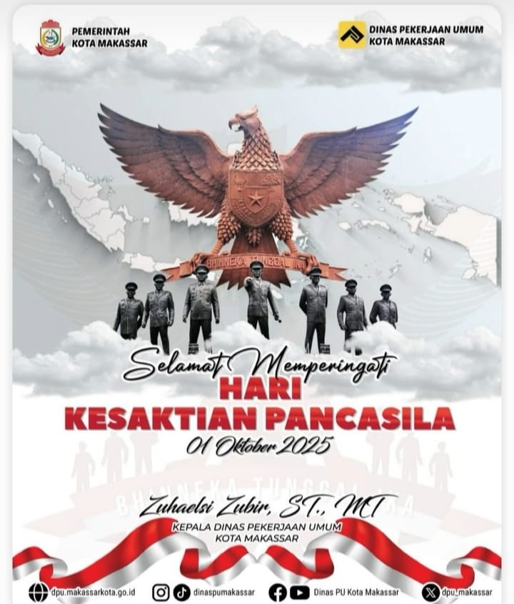 Kepala Dinas PU Kota Makassar, Zuhaelsi Zubir menyampaikan selamat memperingati hari Kesaktian Pancasila lewat akun Instagram Dinas Pekerjaan Umum Kota Makassar, Rabu, (1/10/25).