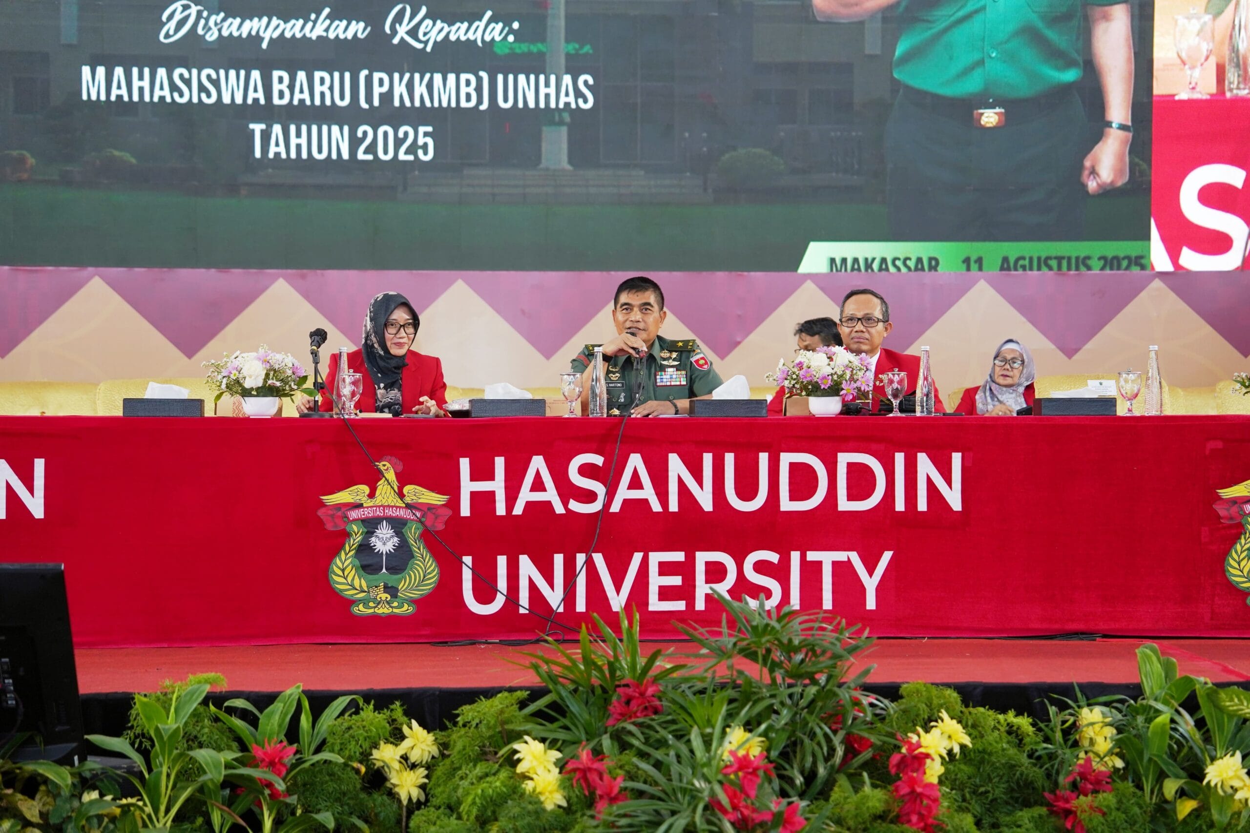 infonetizen.com // Makassar – Kepala Staf Kodam (Kasdam) XIV/Hasanuddin Brigjen TNI Sugeng Hartono, S.E, M.M., menjadi Narasumber dalam Pengenalan Kehidupan Kampus bagi Mahasiswa Baru (PKKMB) Universitas Hasanuddin dengan Materi Jati Diri Bangsa dan Pembinaan Kesadaran Bela Negara, bertempat di JK Arenatorium GOR Unhas, Jl. Politeknik, Kec. Tamalanrea, Kota Makassar. Senin, (11/8/2025).
