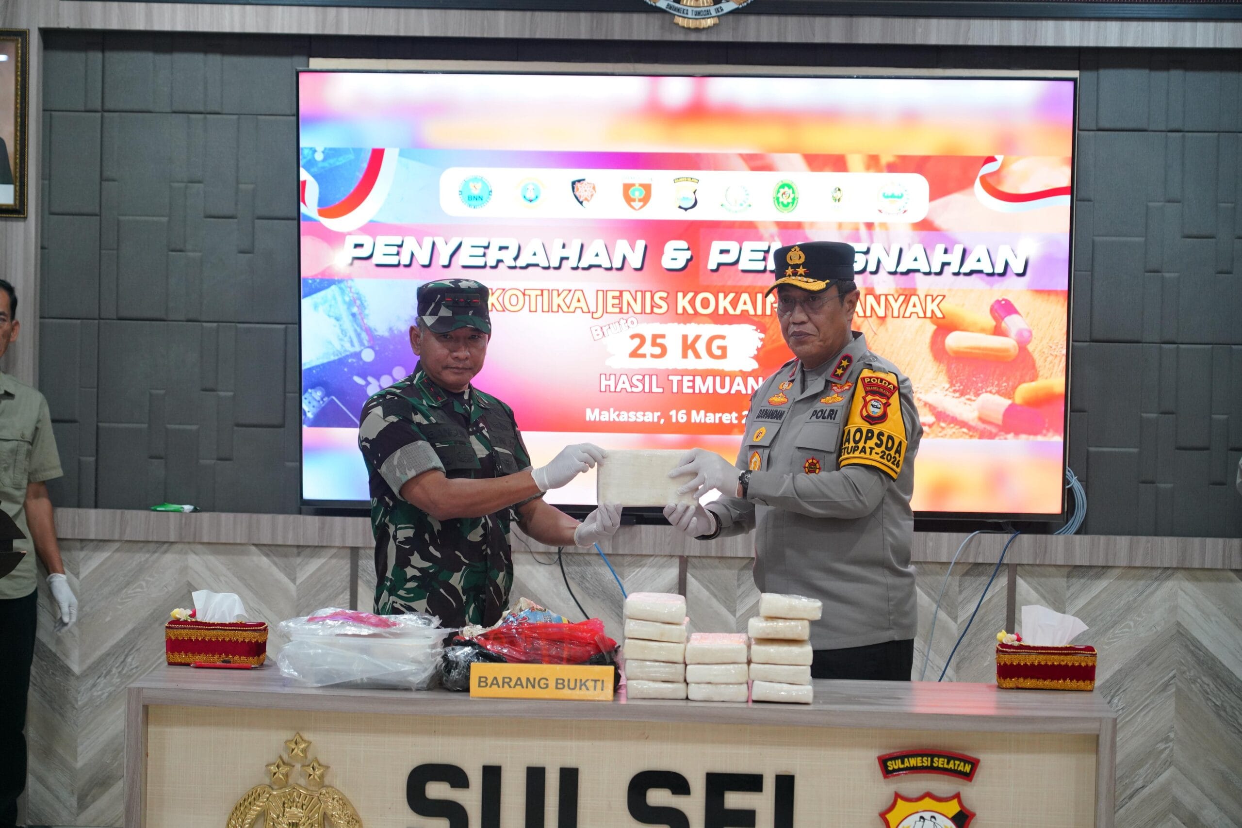 Infonetizen.com // Makassar – Pangdam XIV/Hasanuddin Mayjen TNI Bangun Nawoko menyerahkan barang temuan Narkotika jenis Kokain kepada Kapolda Sulawesi Selatan Irjen Pol. Djuhandhani Rahardjo Puro, yang disaksikan unsur Forkopimda Sulsel di Mapolda Sulsel, Jl. Perintis Kemerdekaan, Kota Makassar. Senin, (16/3/2026).