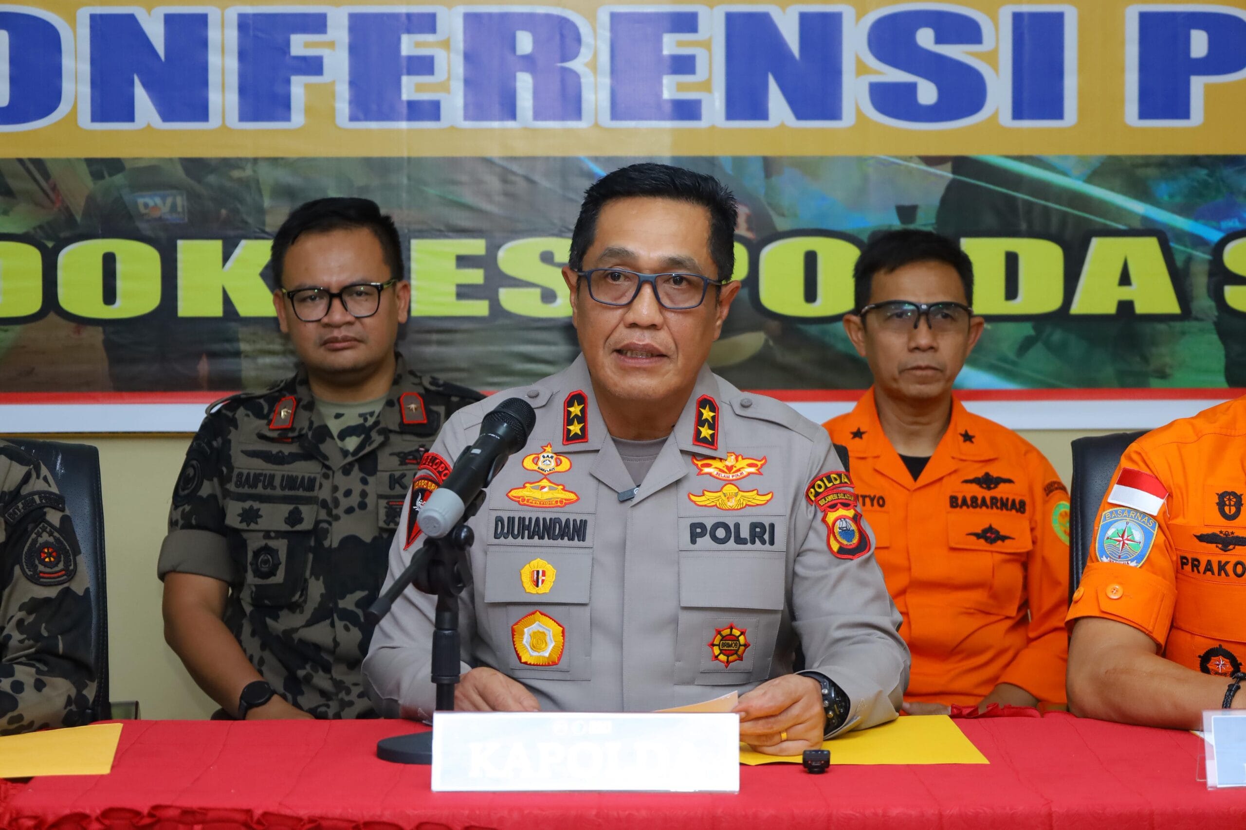Konferensi pers dipimpin langsung oleh Kapolda Sulawesi Selatan Irjen Pol. Djuhandhani Rahardjo Puro, S.H., M.H., bersama Dirjen PSDKP KKP Dr. Pung Nugroho Saksono, A.Pi., M.M., Deputi Operasi Basarnas Mayor Jenderal TNI (Mar) Edy Prakoso, S.E., M.M., M.TR.Opsla, Kapusident Bareskrim Polri Brigjen Pol. Mashudi, S.I.K., S.H., M.Hum, Karo Labdokkes Pusdokkes Polri Brigjen Pol. Dr. dr. Sumy Hastry Purwanti, Sp.F., serta Kabiddokkes Polda Sulsel Kombes Pol. dr. Muhammad Haris, M.A.R.S., QHIA.