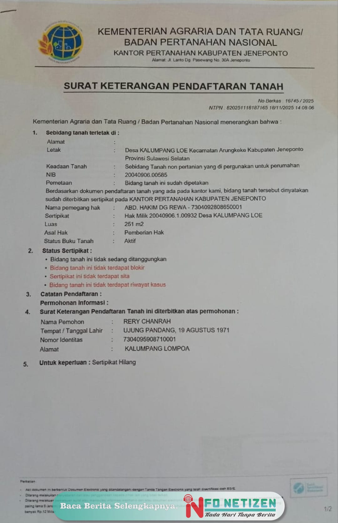 Menindaklanjuti laporan tersebut, Badan Pertanahan Nasional (BPN) Kabupaten Jeneponto telah menerbitkan Surat Keterangan Pendaftaran Tanah (SKPT) sebagai bagian dari syarat pengurusan sertifikat pengganti.